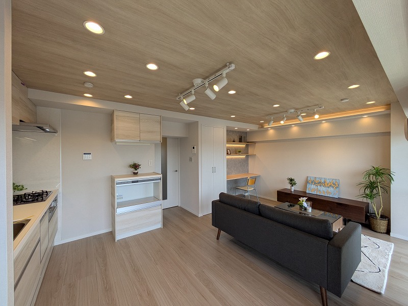 室内は新規リノベーションが実施されており、キッチン・浴室・洗面・トイレなどの水回り設備を一新。フローリングや建具、クロスなども張り替えられており、築年数を感じさせない内装に仕上がっています。