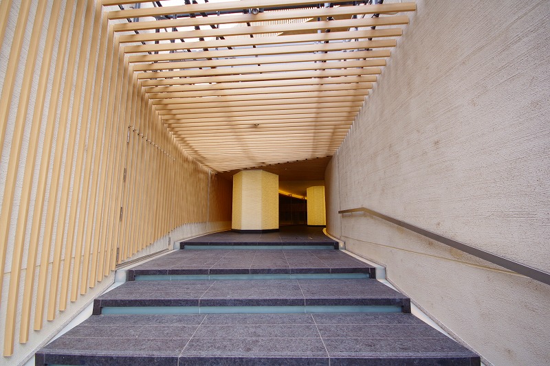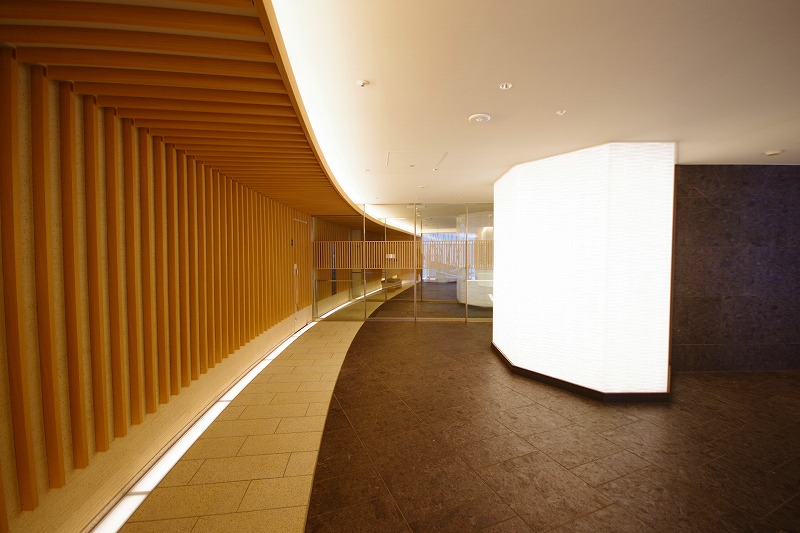 木調のルーバーくぐると緩やかにカーブしていているのでエントランスが見えない形状になっており、全部を見せないことで幻想的な空間を演出しています。